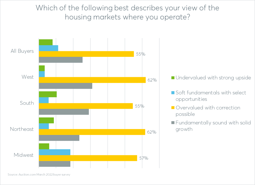 The rising risk of a housing correction was a common view among distressed property auction buyers in early 2022, according to a March 2022 survey of more than 250 Auction.com buyers. More than half of those surveyed (55 percent) described their local housing market as “overvalued with a correction possible,” up from 40 percent who described their local market that way in the first quarter of 2021.