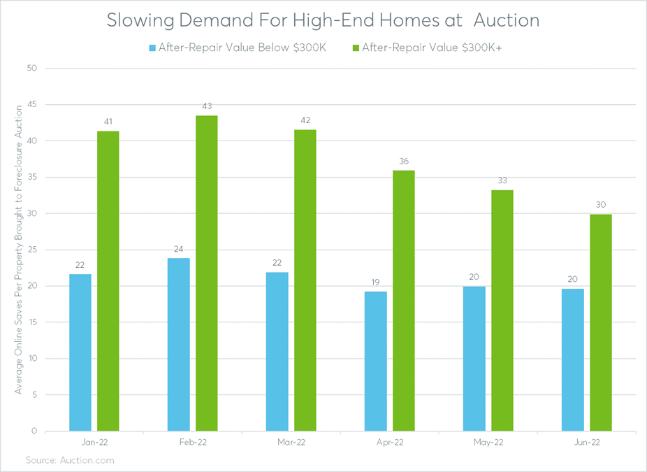 Lizell is not the only buyer shying away from higher-end homes, according to buyer behavior data from Auction.com. The average number of online saves per property brought to auction decreased 34 percent between February and June for properties with an estimated after-repair market value of more than $300,000. The saves metric decreased at half that rate (down 17 percent) for properties with an estimated after-repair market value below $300,000.