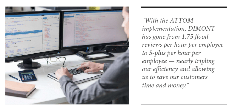 “With the ATTOM implementation, DIMONT has gone from 1.75 flood reviews per hour per employee to 5-plus per hour per employee — nearly tripling our efficiency and allowing us to save our customers time and money.