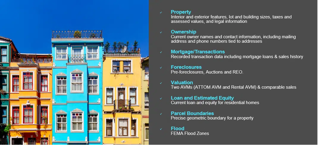 ATTOM’s robust property data is leveraged by customers to innovate in a variety of industries, including Real Estate, Insurance, Mortgage, Marketing, Government and Academia. By utilizing ATTOM’s robust property data, ATTOM clients not only create innovation but gain that competitive advantage within their industries. End-users of the data include developers, data scientists, risk managers, investors, policymakers and analysts. Discover ATTOM’s Table of Data Elements.
