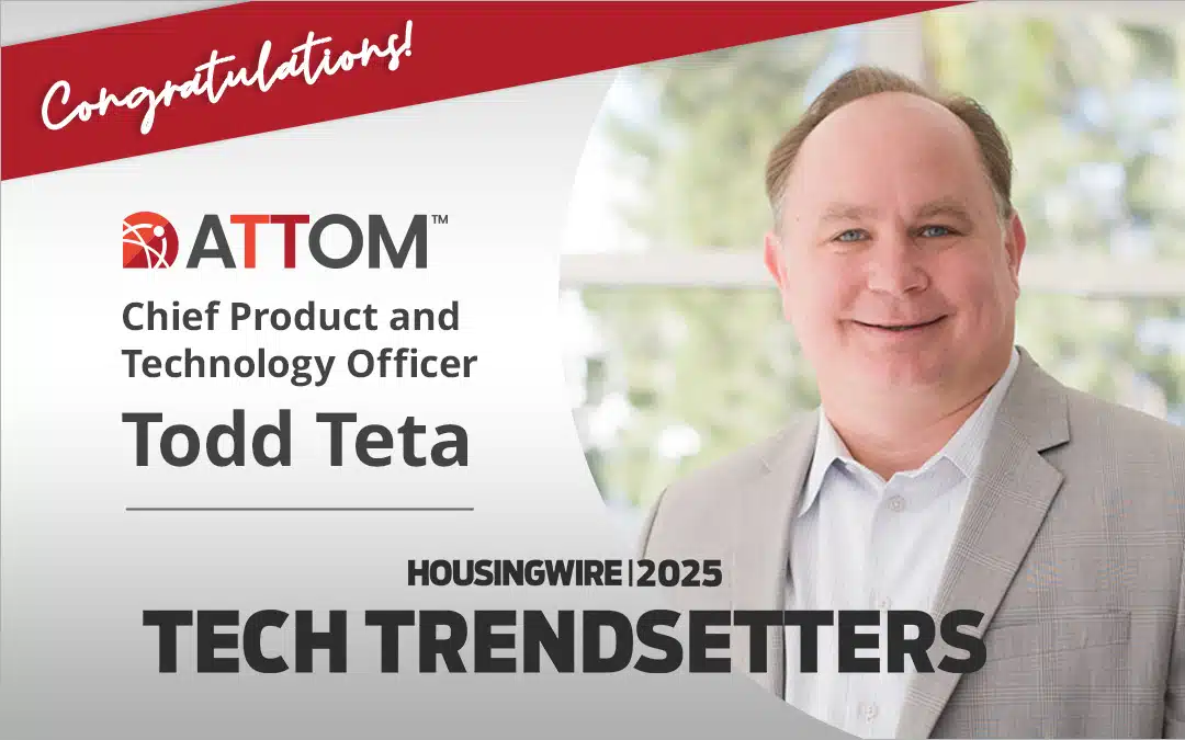 IRVINE, Calif. – Nov. 10, 2025 – ATTOM, a leading curator of land, property data, and real estate analytics, is pleased to announce that Todd Teta, Chief Product and Technology Officer, has been named a recipient of the annual HousingWire Tech Trendsetters Award. This award celebrates the individuals behind the technology — the visionaries, engineers, product leaders, and data strategists who are transforming how housing professionals work, connect, and serve their customers.