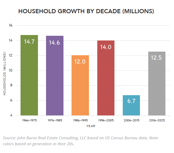 4. 25.8 million newly formed households, 13.3 million of which will move to a household abandoned by someone who passes away or moves into an assisted living facility. The net gain will be 12.5 million households, which is an 86 percent increase over the paltry growth from 2005 to 2010. The record number of people passing away has been one big reason that net household formation has been slow. Nonetheless, these 25.8 million want to live differently than prior generations, and will fill their homes up with all sorts of technology. While more people than usual have been living urban too, three times as many live suburban.