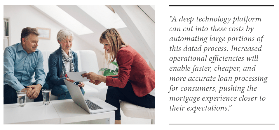 Currently, the Mortgage Bankers Association estimates that the average cost for a lender to originate a mortgage is a record-high $8,887, largely thanks to the hours of manual processing that must be done to underwrite and fund a loan. A deep technology platform can cut into these costs by automating large portions of this dated process. Increased operational efficiencies will enable faster, cheaper, and more accurate loan processing for consumers, pushing the mortgage experience closer to their expectations.