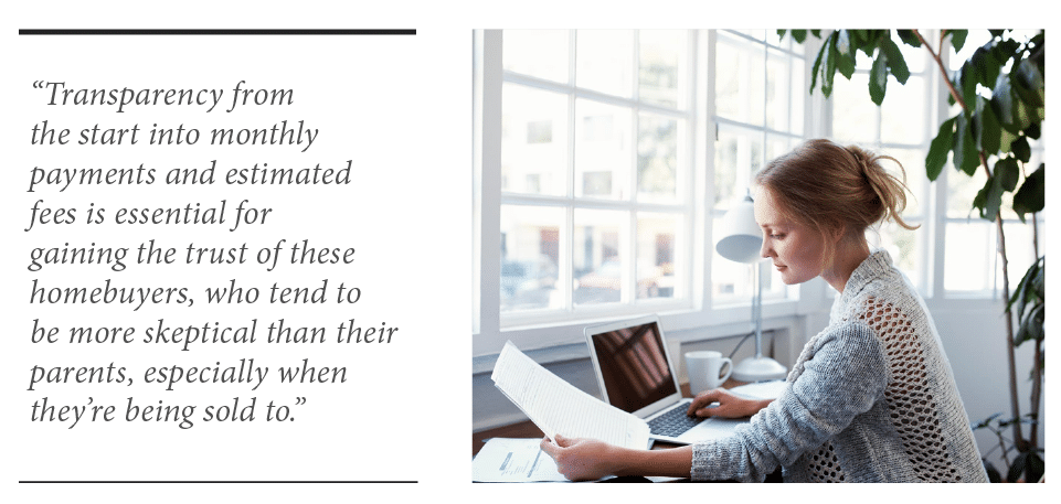 Choosing a mortgage is something that most consumers will do only a handful of times in their lives. So while many will do some research on the differences between a 30-year fixed and a 5-year ARM, they turn to their lenders to understand their situation—ideally via data provided online—and help them find and choose the product that best fits their situation. They want to be able to see the impacts of trading points—exchanging paying more up front for paying less monthly, or vice versa—on their estimates and then actually trade points with the click of a button. Transparency from the start into monthly payments and estimated fees is essential for gaining the trust of these homebuyers, who tend to be more skeptical than their parents, especially when they’re being sold to.
