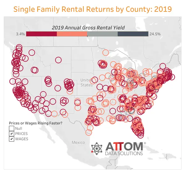 For this report, ATTOM Data Solutions looked at all U.S. counties with a population of 100,000 or more and with sufficient home price and rental rate data. Rental returns were calculated using annual gross rental yields: the 2019 50th percentile rent estimates for three-bedroom homes in each county from the U.S. Department of Housing and Urban Development (HUD), annualized, and divided by the median sales price of residential properties in each county.
