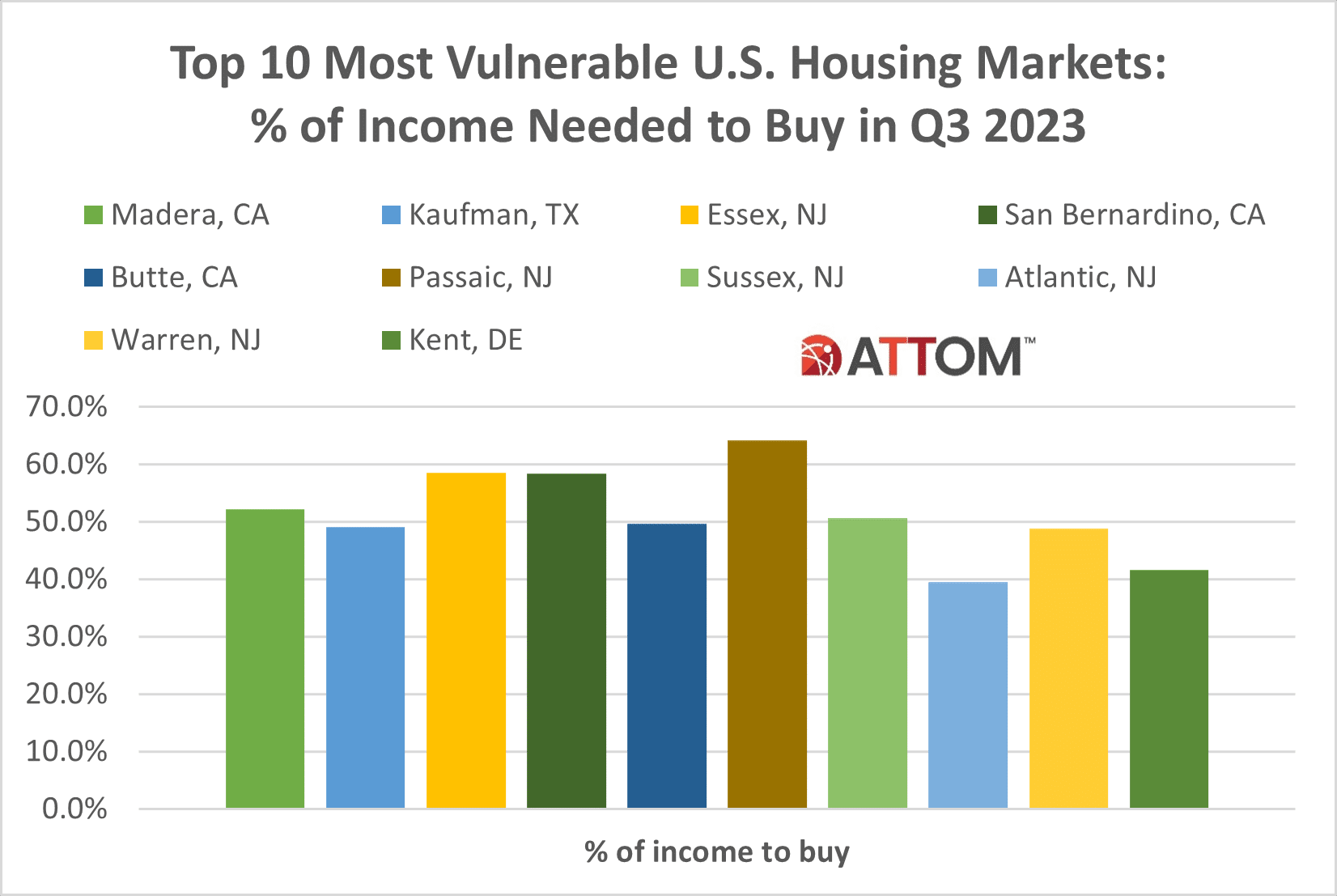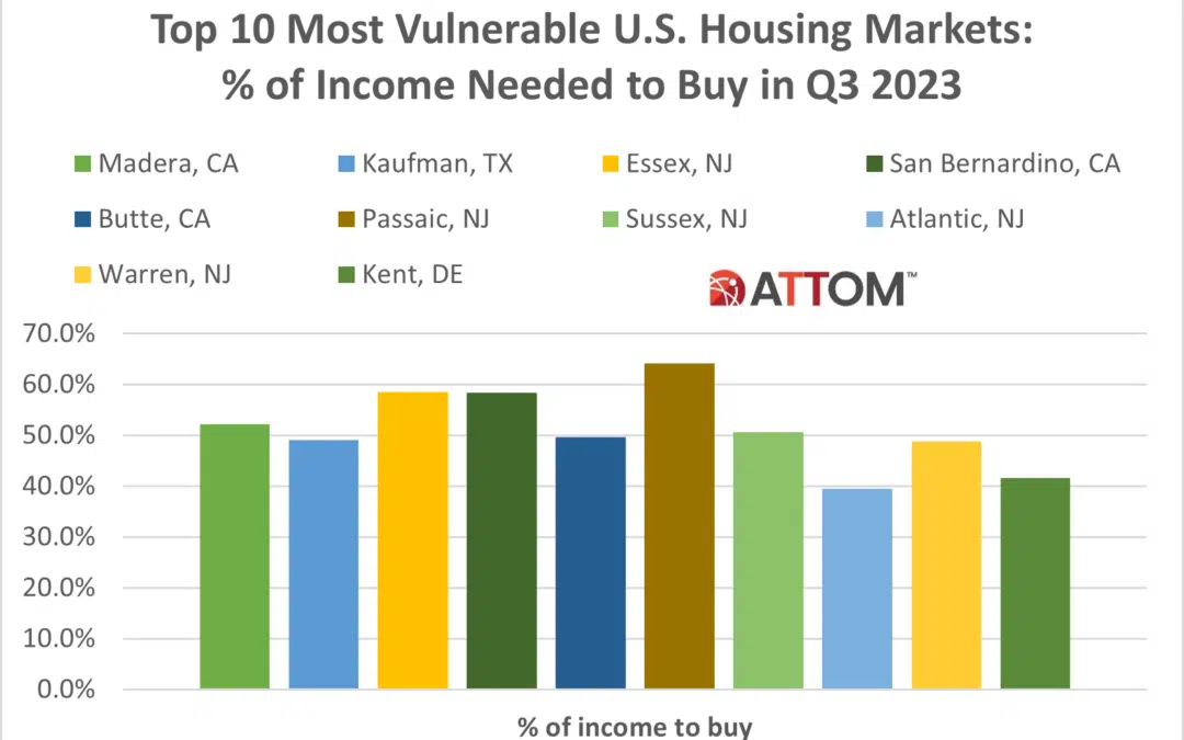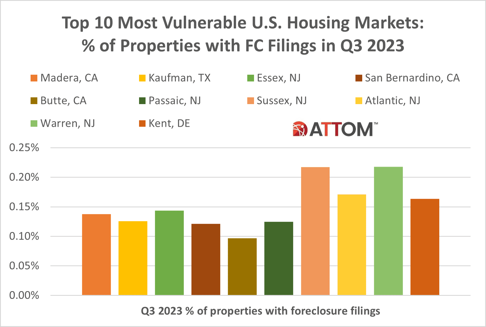 According to ATTOM’s just released Q3 2023 Special Housing Risk Report, California, New Jersey and Illinois have the highest concentrations of housing markets most vulnerable to declines, based on home affordability, foreclosures, underwater mortgages and other measures in the third quarter.