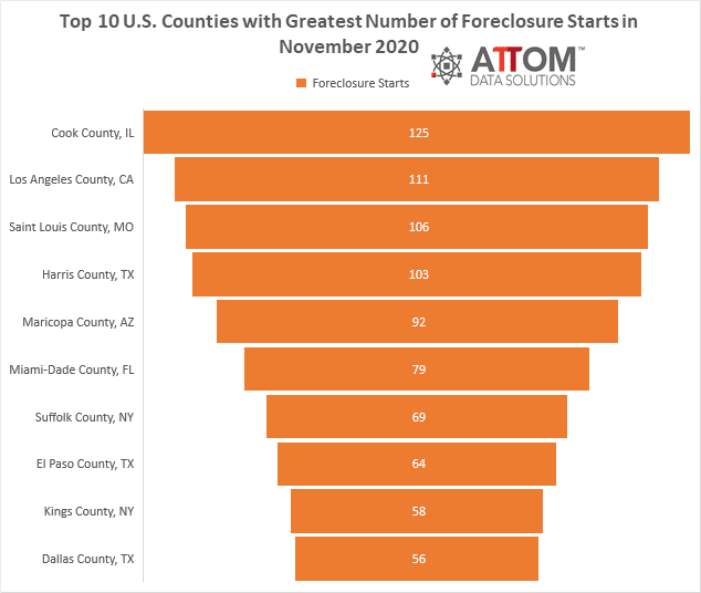 In drilling down to the county-level, among those counties with a population greater than 500,000, the top 10 with the greatest number of foreclosure starts in November 2020 were Cook County, IL (125 foreclosure starts); Los Angeles County, CA (111 foreclosure starts); Saint Louis County, MO (106 foreclosure starts); Harris County, TX (103 foreclosure starts); Maricopa County, AZ (92 foreclosure starts); Miami-Dade County, FL (79 foreclosure starts); Suffolk County, NY (69 foreclosure starts); El Paso County, TX (64 foreclosure starts); Kings County, NY (58 foreclosure starts); and Dallas County, TX (56 foreclosure starts).
