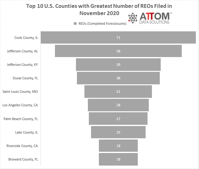 In this post, we take a deep data dive to isolate the top 10 county-level housing markets, among those with a population greater than 500,000, that posted the greatest number of REOs filed in November 2020. Those counties include: Cook County, IL (71 REOs filed); Jefferson County, AL (58 REOs filed); Jefferson County, KY (39 REOs filed); Duval County, FL (38 REOs filed); Saint Louis County, MO (31 REOs filed); Los Angeles County, CA (28 REOs filed); Palm Beach County, FL (27 REOs filed); Lake County, IL (25 REOs filed); Riverside County, CA (18 REOs filed); and Broward County, FL (18 REOs filed).