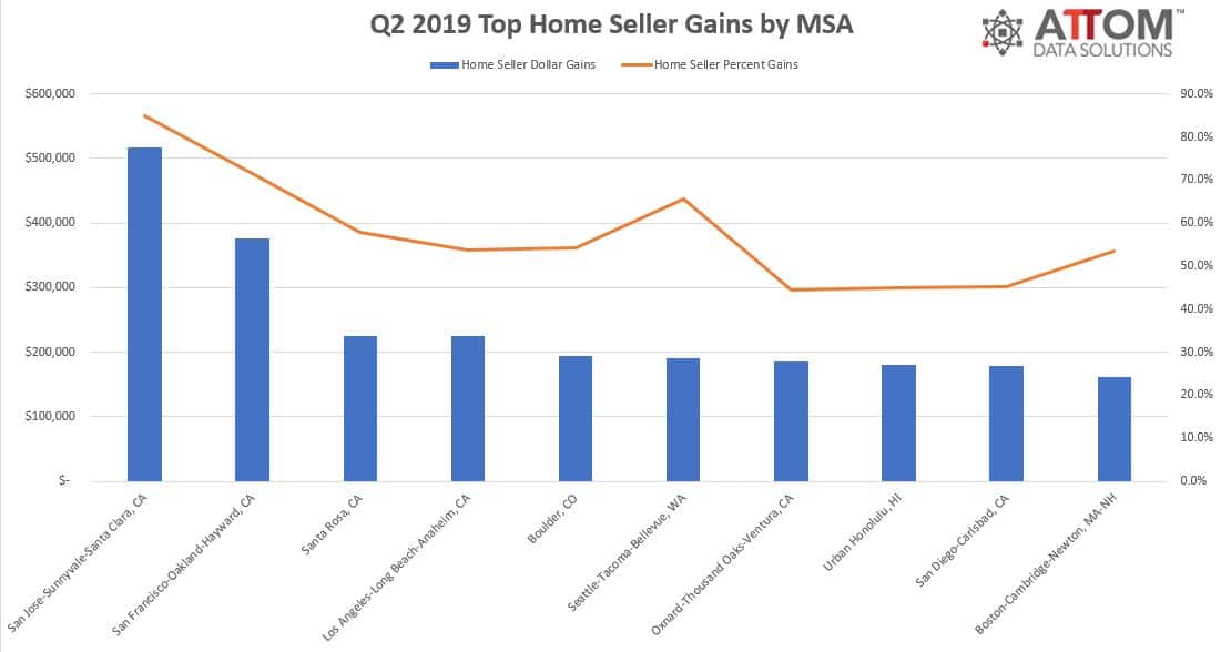 ATTOM Data wanted to showcase those markets, where home sellers are gaining the most on their homes. Among 149 metropolitan statistical areas analyzed in the report, those with the highest average home seller dollar gains in Q2 2019 were San Jose, California ($517,000); San Francisco, California ($376,000); Santa Rosa, California ($225,500); Los Angeles, California ($224,500); and rounding out the top 5 is a non-California area – Boulder, Colorado ($194,741).