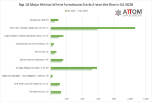 Among those metros with 1 million people or more, the top 10 posting quarterly increases in foreclosure starts or holding steady in Q3 2020 include: Kansas City, MO-KS (up 94 percent); New York-Newark-Jersey City, NY-NJ-PA (81 percent); Virginia Beach-Norfolk-Newport News, VA-NC (up 59 percent); Indianapolis-Carmel-Anderson, IN (up 42 percent); Richmond, VA (up 37 percent); Detroit-Warren-Dearborn, MI (up 15 percent); Chicago-Naperville-Elgin, IL-IN-WI (up 11 percent); Nashville-Davidson–Murfreesboro–Franklin, TN (up 5 percent); Charlotte-Concord-Gastonia, NC-SC (up 4 percent); and Cleveland-Elyria, OH (no change).