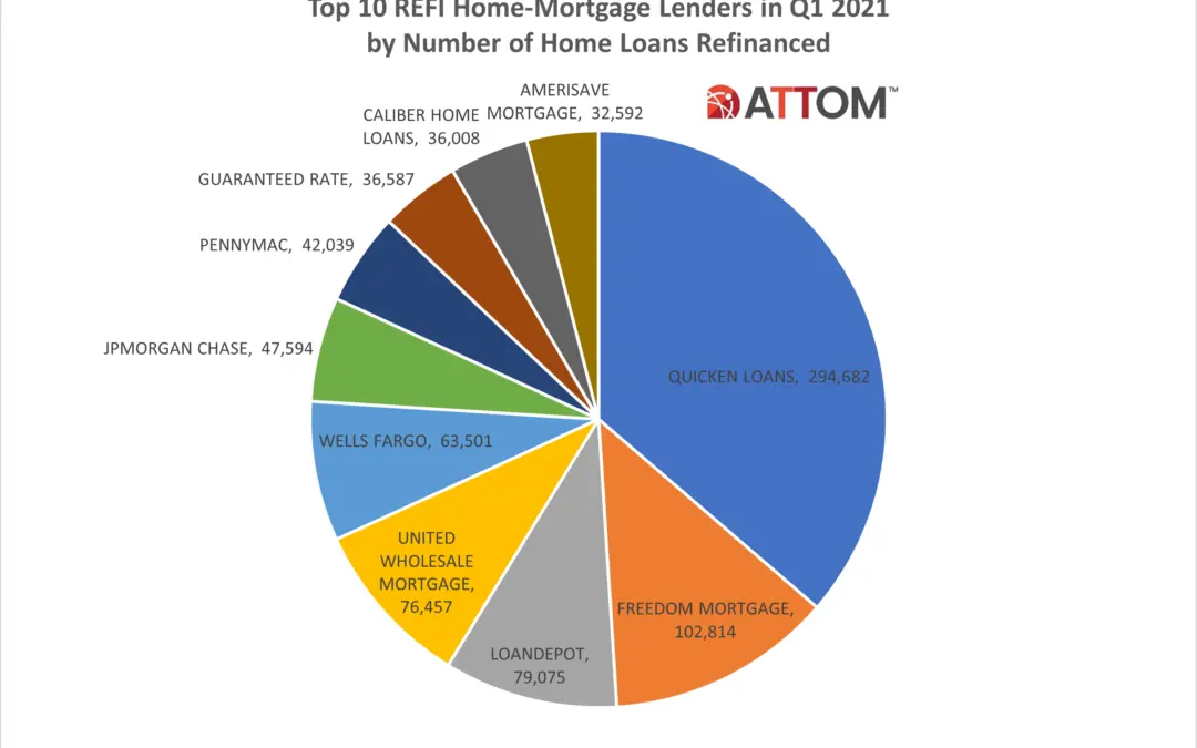 In this post, we take a deep dive into the data behind ATTOM’s Q1 2021 U.S. Residential Property Mortgage Origination Report to uncover the top 10 REFI mortgage lenders in Q1 2021 nationwide. Those lenders include: QUICKEN LOANS (294,682 REFI loans); FREEDOM MORTGAGE (102,814 REFI loans); LOANDEPOT (79,075 REFI loans); UNITED WHOLESALE MORTGAGE (76,457 REFI loans); WELLS FARGO (63,501 REFI loans); JPMORGAN CHASE (47,594 REFI loans); PENNYMAC (42,039 REFI loans); GUARANTEED RATE (36,587 REFI loans); CALIBER HOME LOANS (36,008 REFI loans); and AMERISAVE MORTGAGE (32,592 REFI loans).