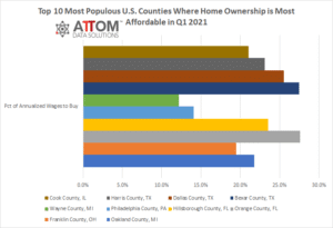 According to ATTOM’s Q1 2021 home affordability analysis, among the 552 counties analyzed for the report, 59 percent had major home-ownership expenses on typical homes in Q1 2021 that were affordable for average local wage earners, based on the 28-percent guideline. The largest of those counties included Cook County (Chicago), IL; Harris County (Houston), TX; Dallas County, TX; Bexar County (San Antonio), TX, and Wayne County (Detroit), MI.