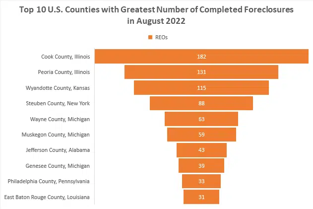 In this post, we dive deeper into the data behind ATTOM’s August 2022 foreclosure report to uncover more granular, county level data. The top 10 counties that saw the greatest number of REOs in August 2022 included: Cook County, Illinois (182 REOs); Peoria County, Illinois (131 REOs); Wyandotte County, Kansas (115 REOs); Steuben County, New York (88 REOs); Wayne County, Michigan (63 REOs); Muskegon County, Michigan (59 REOs); Jefferson County, Alabama (43 REOs); Genesee County, Michigan (39 REOs); Philadelphia County, Pennsylvania (33 REOs); and East Baton Rouge County, Louisiana (31 REOs).