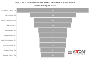 In this post, we dig a bit deeper to uncover the top 10 U.S. counties with the greatest numbers of foreclosure starts in August 2020. Those counties include: Los Angeles County, CA (197); Harris County, TX (126); Miami-Dade County, FL (105); Cook County, IL (102); Duval County, FL (79); Broward County, FL (77); Palm Beach County, FL (73); Jefferson County, KY (73); Hidalgo County, TX (67); and Riverside County, CA (65).