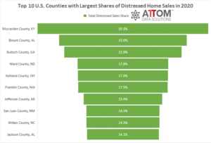 Among those counties with a population of 50,000 or more and 50 or more total distressed home sales in 2020, the top 10 were Mccracken County, KY (33.3 percent); Blount County, AL (25.0 percent); Bulloch County, GA (22.9 percent); Ward County, ND (17.8 percent); Ashland County, OH (17.6 percent); Franklin County, MA (17.5 percent); Jefferson County, AR (15.4 percent); San Juan County, NM (14.3 percent); Wilkes County, NC (14.3 percent); and Jackson County, AL (14.1 percent).