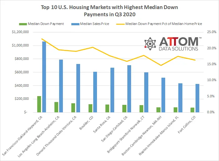 The top 10 metros with the highest median down payments in Q3 2020 were: San Francisco-Oakland-Hayward, CA ($243,000); Los Angeles-Long Beach-Anaheim, CA ($154,000); Oxnard-Thousand Oaks-Ventura, CA ($138,300); Boulder, CO ($123,600); Santa Rosa, CA ($118,550); San Diego-Carlsbad, CA ($112,000); Bridgeport-Stamford-Norwalk, CT ($106,600); Boston-Cambridge-Newton, MA-NH ($76,000); Naples-Immokalee-Marco Island, FL ($76,000); and Fort Collins, CO ($69,125).