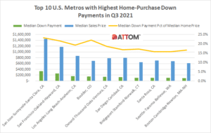 In this post, we take a deep data dive among U.S. metro areas with a population greater than 200,000 and 1,000 or more loans originated in Q3 2021, to uncover the top 10 markets with the highest median down payments on single-family homes and condos purchased with financing in Q3 2021.