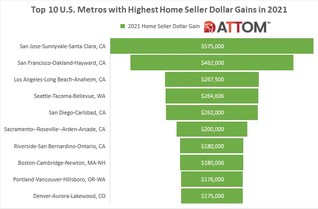 In this post, we dig deep into the data behind the ATTOM Year-End 2021 U.S. home sales report to rank the top 10 largest metros with the greatest home seller gains realized in typical profits. Among those metros with at least 1 million people, the top 10 that saw the largest dollar gains from home sales in 2021 included: San Jose-Sunnyvale-Santa Clara, CA ($575,000 dollar gain); San Francisco-Oakland-Hayward, CA ($462,000); Los Angeles-Long Beach-Anaheim, CA ($267,500); Seattle-Tacoma-Bellevue, WA ($264,606; San Diego-Carlsbad, CA ($262,000); Sacramento–Roseville–Arden-Arcade, CA ($200,000); Riverside-San Bernardino-Ontario, CA ($180,000); Boston-Cambridge-Newton, MA-NH ($180,000); Portland-Vancouver-Hillsboro, OR-WA ($176,000); and Denver-Aurora-Lakewood, CO ($175,000).