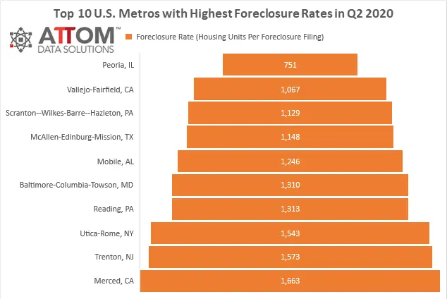 In this post, we take a look at those metros with a population of 200,000 or more that saw the highest foreclosure rates in Q2 2020. Those areas include: Peoria, IL (with one in every 751 housing units receiving a foreclosure filing); Vallejo-Fairfield, CA (one in every 1,0670; Scranton–Wilkes-Barre–Hazleton, PA (one in every 1,129); McAllen-Edinburg-Mission, TX (one in every 1,148); Mobile, AL (one in every 1,246); Baltimore-Columbia-Towson, MD (one in every 1,310); Reading, PA (one in every 1,313); Utica-Rome, NY (one in every 1,543); Trenton, NJ (one in every 1,573) and Merced, CA (one in every 1,663).