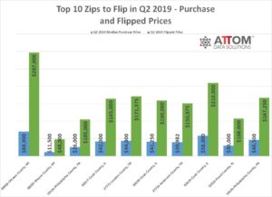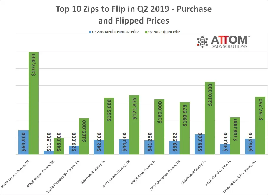 The Q2 2019 gross flipping profit for these top 10 zips were as follows: 49426-Ottawa County, MI ($227,100); 48205-Wayne County, MI ($36,500); 19134-Philadelphia County, PA ($79,000); 60617-Cook County, IL ($123,000); 37771-Loudon County, TN ($127,375); 60628-Cook County, IL ($118,750); 37716-Anderson County, TN ($110,993); 60619-Cook County, IL ($152,000); 32254-Duval County, FL ($78,000); and 19139-Philadelphia County, PA ($120,750).