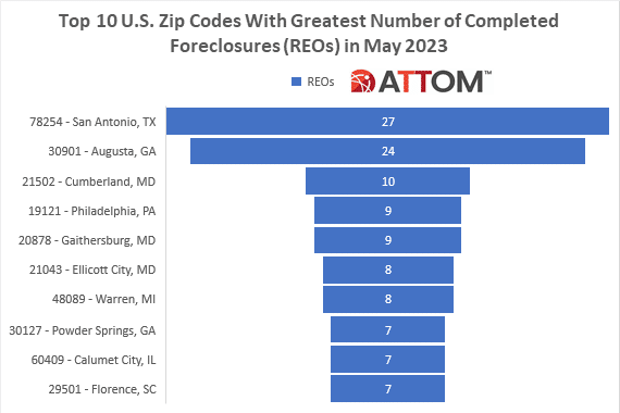 In this post, we dive deep into the data behind ATTOM’s May 2023 U.S. Foreclosure Market Report to uncover those top 10 U.S. zip codes with the greatest number of REOs in May 2023. Those ZIPS included: 78254 in San Antonio, TX (27 REOs); 30901 in Augusta, GA (24 REOs); 21502 in Cumberland, MD (10 REOs); 19121 in Philadelphia, PA (9 REOs); 20878 in Gaithersburg, MD (9 REOs); 21043 in Ellicott City, MD (8 REOs); 48089 in Warren, MI (8 REOs); 30127 in Powder Springs, GA (7 REOs); 60409 in Calumet City, IL (7 REOs); and 29501 in Florence, SC (7 REOs).