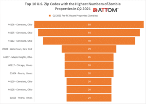 In this post, we dive deeper into the data behind our Q2 2021 vacant property and zombie foreclosure report to uncover the top 10 U.S. zip codes with the highest numbers of zombie properties in Q2 2021. Those zips include: 44108 – Cleveland, Ohio (58 zombies); 44105 – Cleveland, Ohio (54 zombies); 44112 – Cleveland, Ohio (49 zombies); 13601 – Watertown, New York (29 zombies); 44137 – Maple Heights, Ohio (26 zombies); 60617 – Chicago, Illinois (26 zombies); 61604 – Peoria, Illinois (26 zombies); 44120 – Cleveland, Ohio (24 zombies); 44128 – Cleveland, Ohio (24 zombies); and 61605 – Peoria, Illinois (24 zombies).