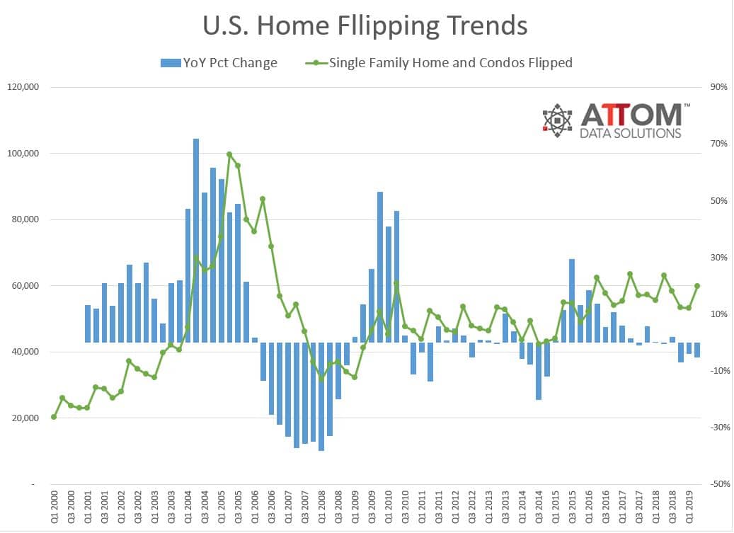 IRVINE, Calif. – September 19, 2019 — ATTOM Data Solutions, curator of the nation’s premier property database and first property data provider of Data-as-a-Service (DaaS), today released its Q2 2019 U.S. Home Flipping Report, which shows that 59,876 U.S. single family homes and condos were flipped in the second quarter of 2019, up 12.4 percent from the previous quarter, but down 5.2 percent from a year ago.
