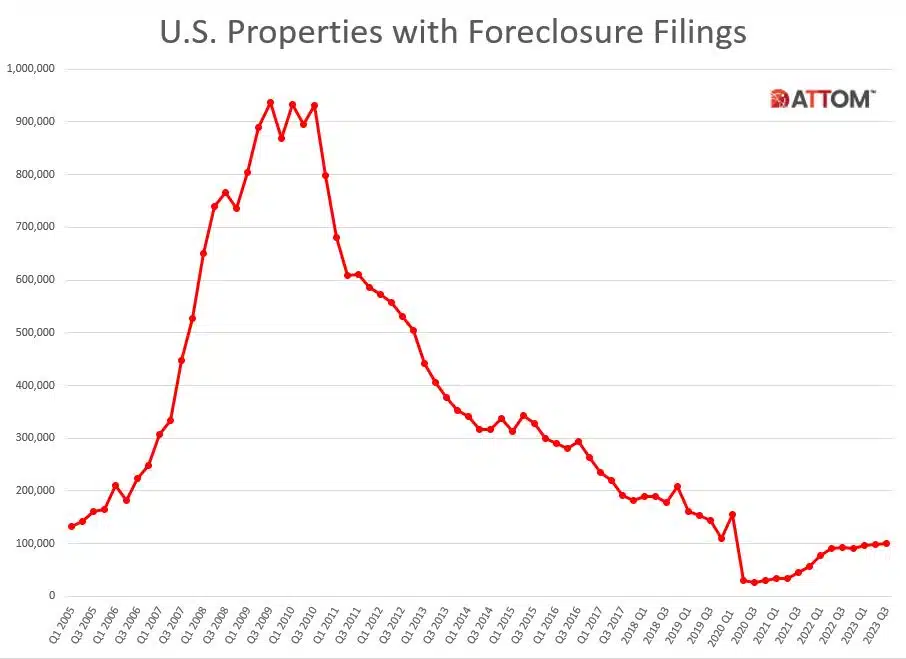 IRVINE, Calif. – Oct. 12, 2023 — ATTOM, a leading curator of land, property, and real estate data, released its Q3 2023 U.S. Foreclosure Market Report, which shows there were a total of 100,546 U.S. properties with foreclosure filings — default notices, scheduled auctions or bank repossessions — up 3 percent from the previous quarter and 9 percent from a year ago.