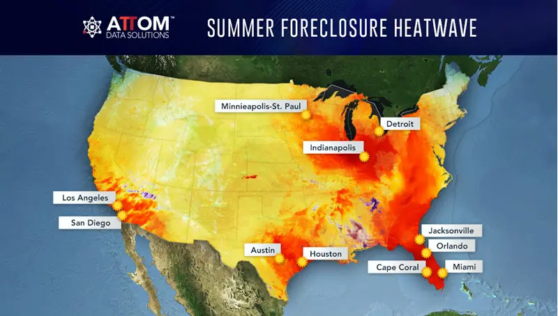 “The increase in foreclosure starts is not just a one-month anomaly in many local markets given that July represented the third consecutive month with a year-over-year increase in 33 metro areas, including Los Angeles, Miami, Houston, Detroit, San Diego and Austin,” said Daren Blomquist, senior vice president with ATTOM Data Solutions. “Gradually loosening lending standards over the past few years have introduced a modicum of risk back into the housing market, and that additional risk is resulting in rising foreclosure starts in a diverse set of markets across the country. Most susceptible to rising foreclosure starts are affordability-challenged markets where homebuyers are more financially stretched and markets with some type of trigger event such as a natural disaster or large-scale layoffs.”