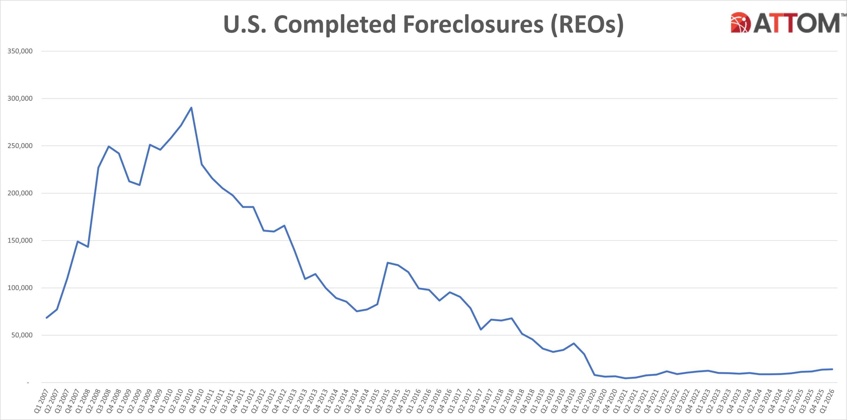 Lenders repossessed 14,020 U.S. properties through foreclosure (REO) in Q1 2026, up 2 percent from the previous quarter and up 45 percent from a year ago.