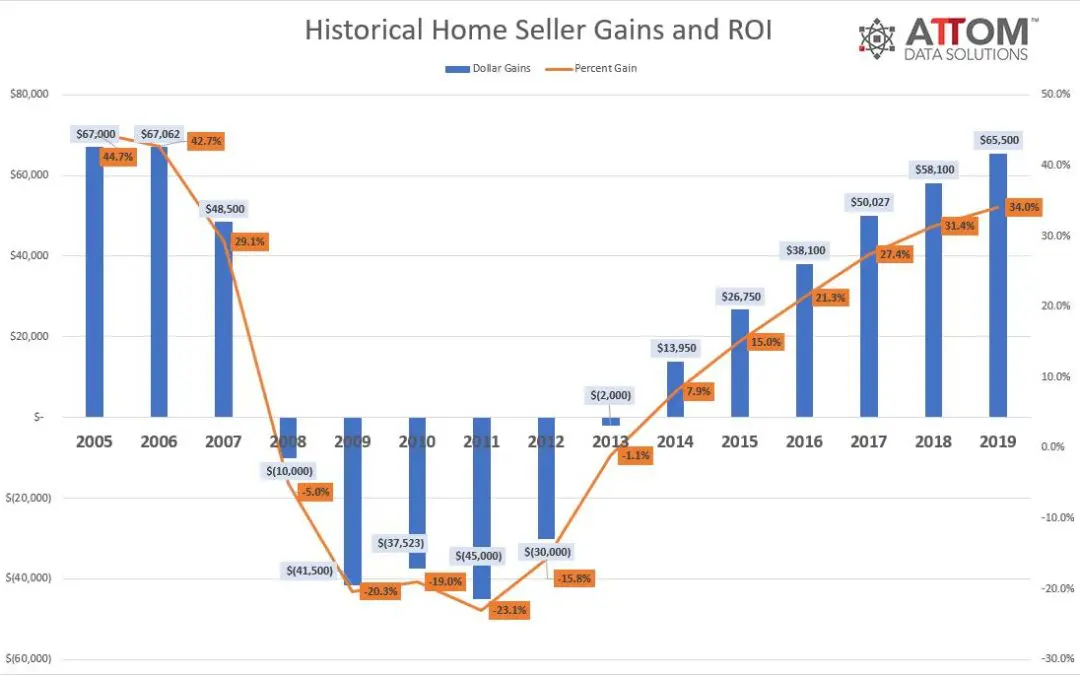 That $65,500 typical home seller profit represented a 34 percent return on investment compared to the original purchase price, up from 31.4 percent last year and up from 27.4 percent in 2017, to the highest average home-seller ROI since 2006.