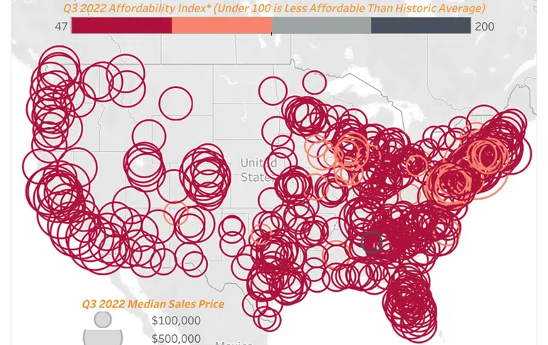 Among the 581 counties in the report, only seven (1 percent) are more affordable than their historic averages in the third quarter of 2022. That is down from 31 percent a year ago and 51 percent in the third quarter of 2020.