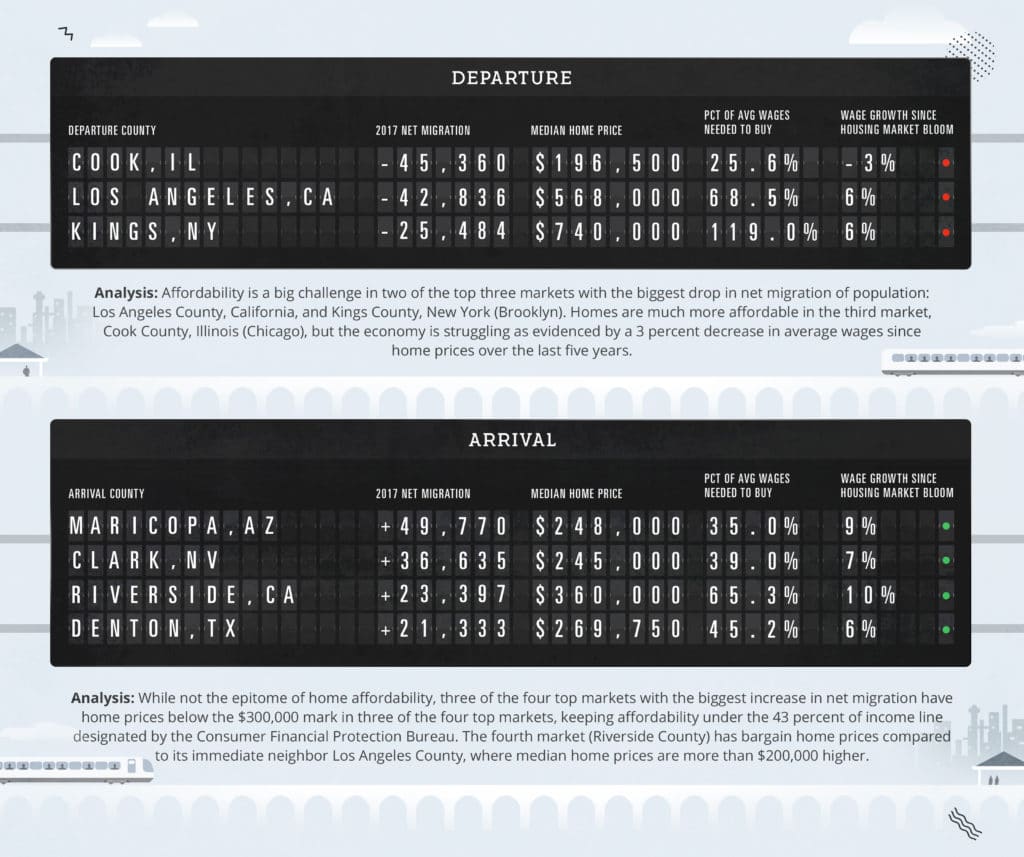 Meanwhile population is migrating to markets that are more reasonably priced with median prices in the $250,000 to $300,000 range in three of the four top markets with the biggest positive net migration in 2017 — Maricopa County, Arizona (Phoenix); Clark County, Nevada (Las Vegas); and Denton County, Texas (Dallas). The fourth market on that list — Riverside County, California in “Inland Empire” of Southern California — has a higher median price of $360,000, but that is a bargain compared to nearby Los Angeles and Orange counties. Riverside County also has relatively strong wage growth as do the other three markets on the top arrivals list.