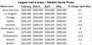 Among the 10 most populous metro areas, prices sank monthly during May in eight, led by Philadelphia, PA (down 14 percent); Washington, D.C. (down 6 percent) and Miami, FL (down 3 percent). The two areas that rose were New York, NY (up 9 percent) and Dallas, TX (up 2 percent).