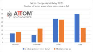 New sales figures from ATTOM Data Solutions show that median home prices stayed the same or dropped from April to May of 2020 in 17 states, as well as in half the metropolitan areas with enough transactions to analyze. (The analysis included 42 states with at least 250 sales and 160 metro areas with at least 100 sales in May.)