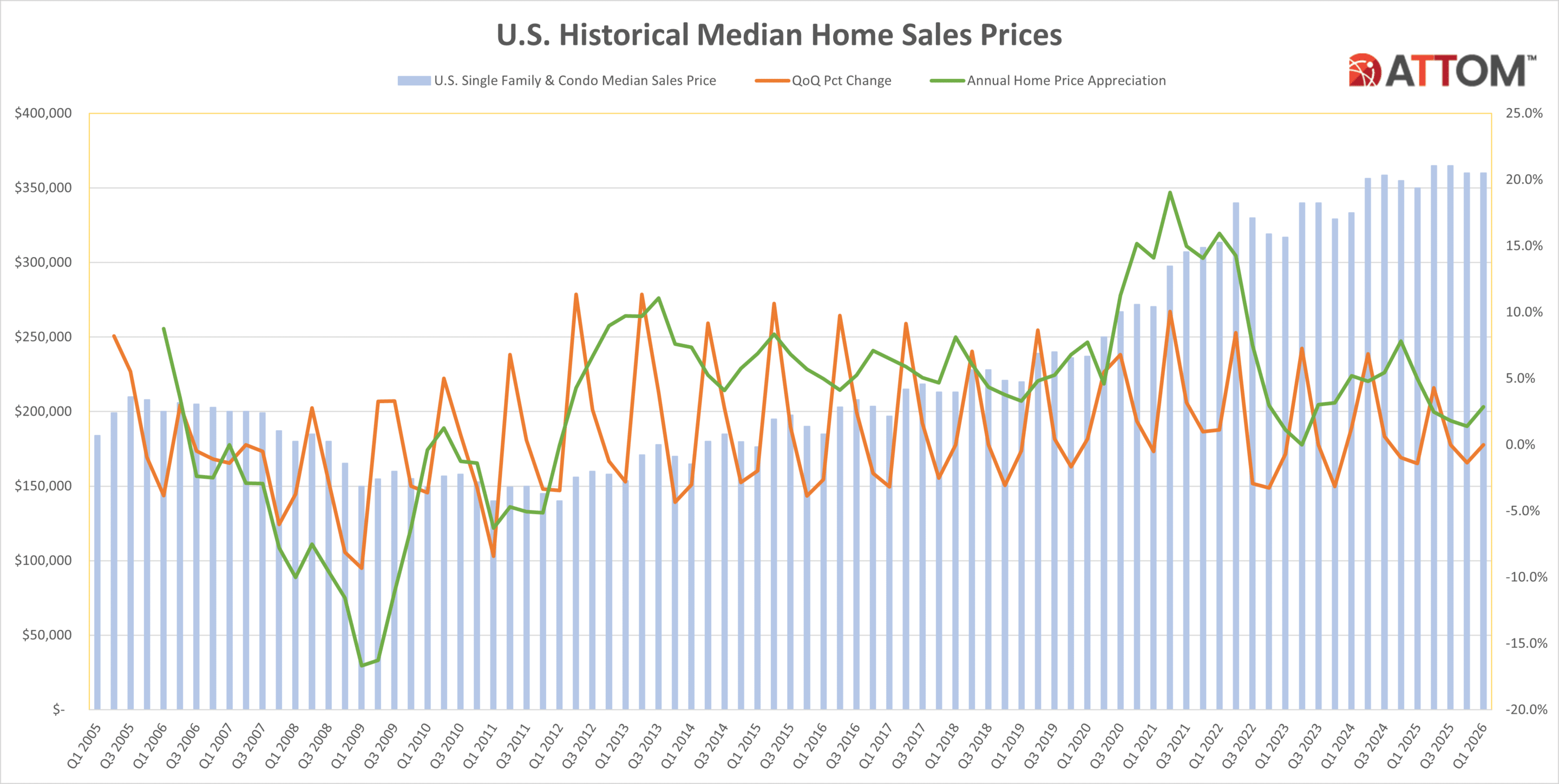 Home prices held steady quarter-over-quarter at $360,000 but were up 3 percent year-over-year from $350,000 in the first quarter of 2025.