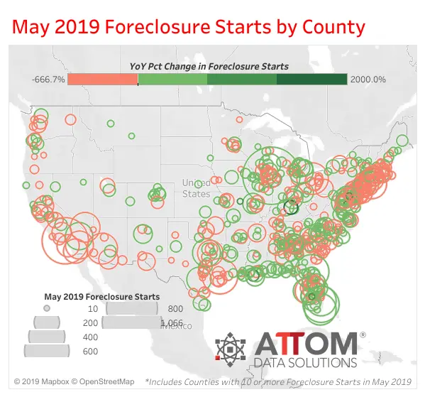 Lenders started the foreclosure process on 30,554 U.S. properties in May 2019, while slightly up (less than 1 percent) from last month they are down 9 percent from May 2018 –fourth consecutive month with an annual decline.