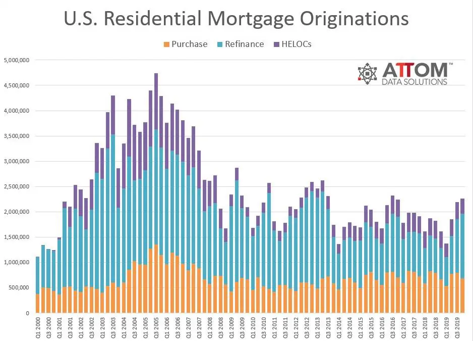 IRVINE, Calif. – Mar. 19, 2020 — ATTOM Data Solutions, curator of the nation’s premier property database and first property data provider of Data-as-a-Service (DaaS), today released its fourth-quarter 2019 U.S. Residential Property Mortgage Origination Report, which shows that 1.27 million refinance mortgages secured by residential property (1 to 4 units) were originated in the fourth quarter of 2019. That figure is up 20 percent from the third quarter of 2019 and up 104 percent from the fourth quarter of 2018, to the highest point since the third quarter of 2013.