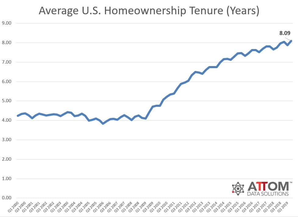 Meanwhile, the report also shows that homeowners who sold in the second quarter had owned an average of 8.09 years, reaching a new peak, up 3 percent from last quarter and up 4 percent from Q2 2018. Homeownership tenure averaged 4.21 years nationwide between Q1 2000 and Q3 2007, prior to the Great Recession. If you are interested in learning more about our home sales data sets, visit our home sales report page.