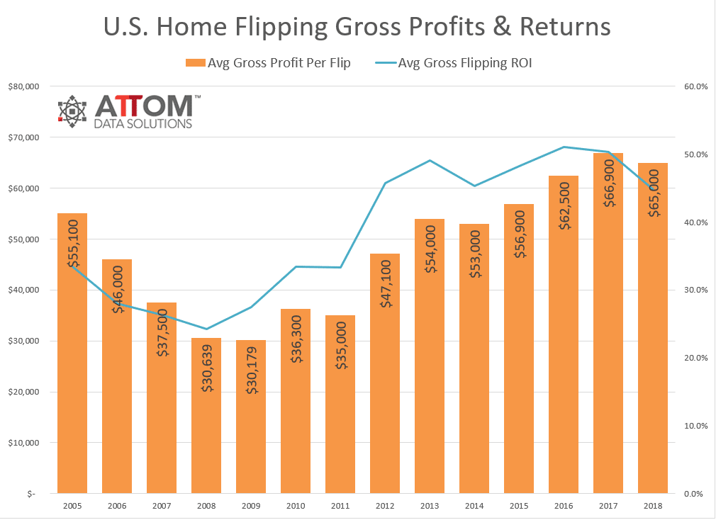 The average gross flipping profit of $65,000 in 2018 represented an average 44.8 percent return on investment (percentage of original purchase price), down from 50.3 percent in 2017 and down from an all-time high average gross flipping ROI of 51.0 percent in 2016.