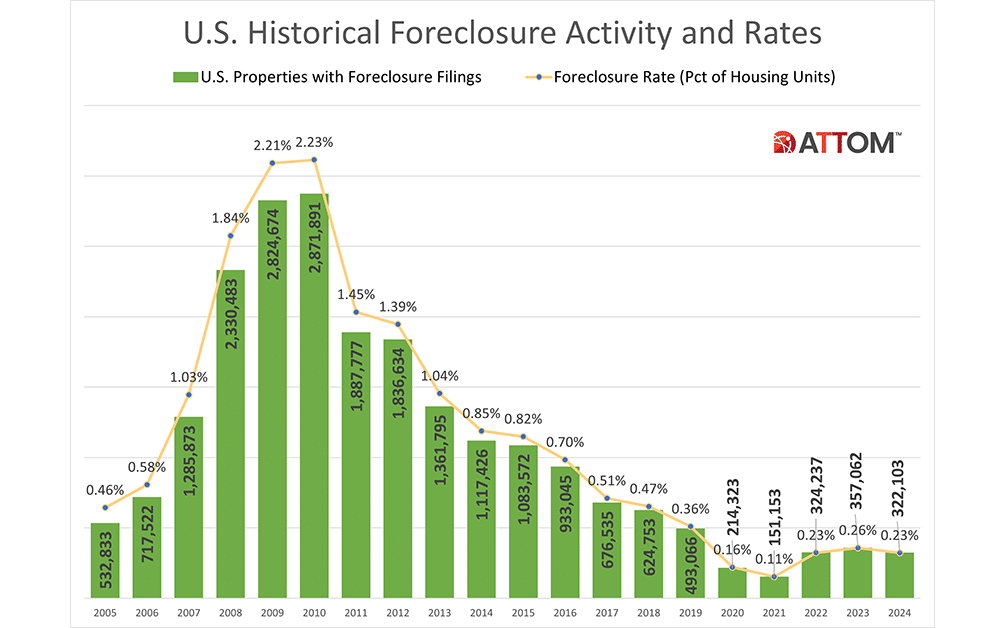 ATTOM’s year-end 2024 foreclosure market report provides a unique count of properties with a foreclosure filing during the year based on publicly recorded and published foreclosure filings collected in more than 3,000 counties nationwide, accounting for more than 99 percent of the U.S. population – also available for licensing or customized reporting. See full methodology below.