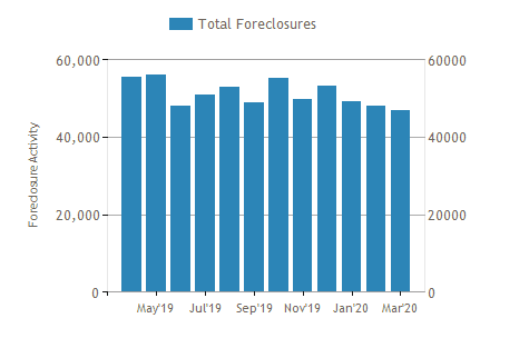 In addition, 46,800 U.S. properties were recorded with foreclosure filings in March 2020 – down 20% from March 2019 – the third consecutive month with a year-over-year decrease in filing activity in the U.S.