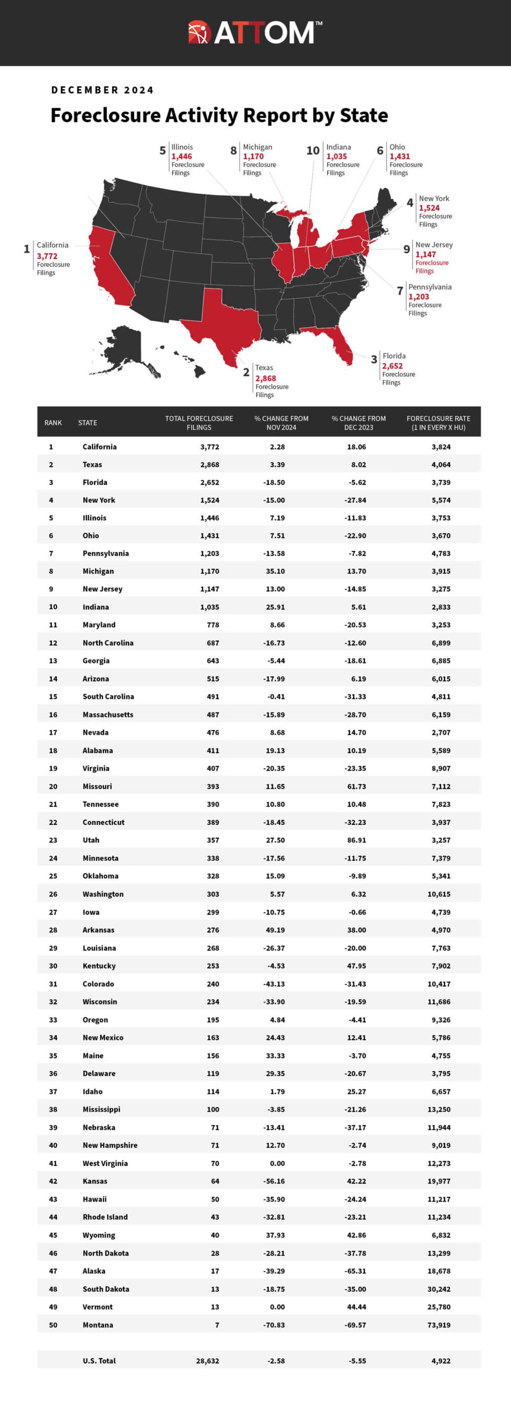 Foreclosure filings experienced a slight decline compared to the previous month and a slightly more pronounced decrease compared to the same period last year. Read on for December 2024 foreclosure filings across all 50 states, starting with the state that had the highest number of foreclosure filings.