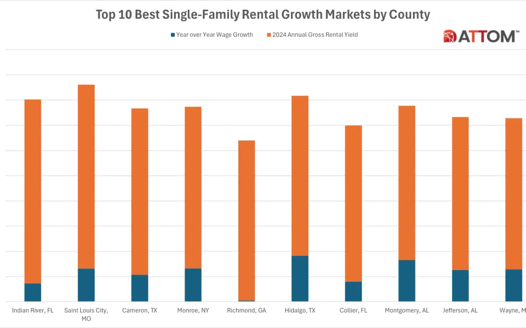 The report noted the top 28 single-family rental growth markets, counties where average wages have increased over the past year and potential annual gross rental yields for three-bedroom properties in 2024 surpass 10 percent. The list of top “SFR Growth” markets includes Chicago, Detroit, and Cleveland.