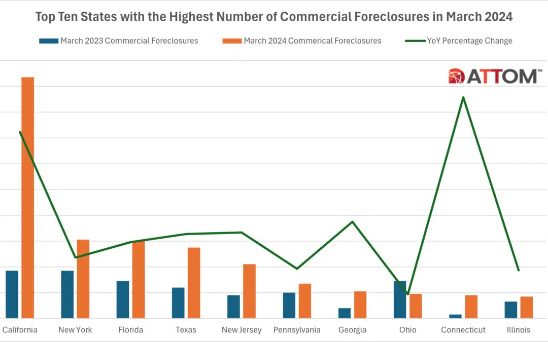 In this post, we take a more granular look by diving deep into the data behind ATTOM’s March 2024 commercial foreclosure report to uncover the top 10 U.S. states with the highest number of commercial foreclosures in March 2024: