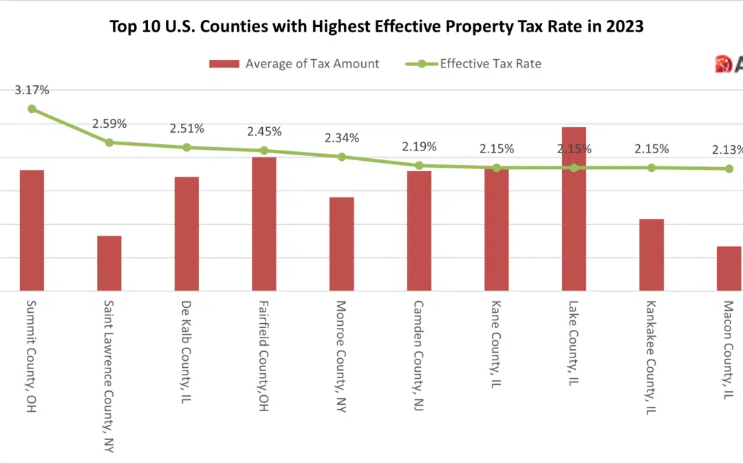 In this post, we take a deep dive into the data behind ATTOM’s 2023 property tax analysis to uncover the larger top 10 U.S. counties with the highest effective property tax rates, among those counties with 10,000 or more single family homes in 2023 and populations over 100,000. Those counties include: Summit County, OH (3.17 percent); Saint Lawrence County, NY (2.59 percent); De Kalb County, IL (2.51 percent); Fairfield County, OH (2.45 percent); Monroe County, NY (2.34 percent); Camden County, NJ (2.19 percent); Kane County, IL (2.15 percent); Lake County, IL (2.1 percent); Kankakee County, IL (2.15 percent); and Macon County, IL (2.13 percent).