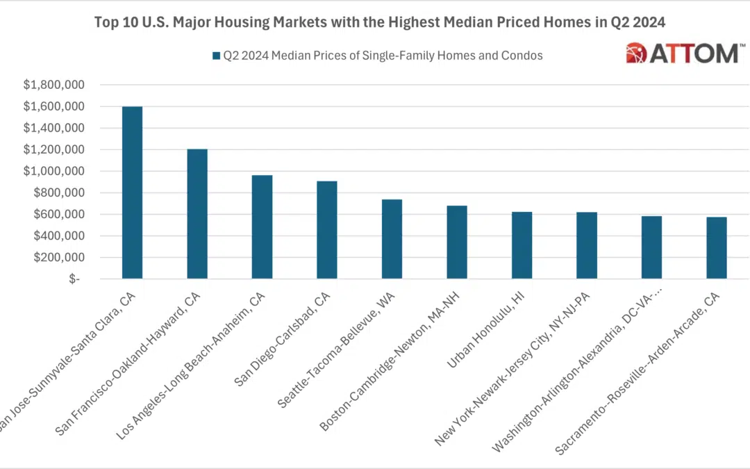 In this post, we dive deeper in the data behind the latest ATTOM home sales report to uncover the top 10 U.S. major markets with the highest median-priced single-family homes and condos in Q2 2024. Among those metros with a population of 1 million or more, those with the highest median-priced homes included: San Jose-Sunnyvale-Santa Clara, CA ($1,600,000); San Francisco-Oakland-Hayward, CA ($1,204,750); Los Angeles-Long Beach-Anaheim, CA ($963,500); San Diego-Carlsbad, CA ($910,000); Seattle-Tacoma-Bellevue, WA ($740,000); Boston-Cambridge-Newton, MA-NH ($680,000); Urban Honolulu, HI ($624,250): New York-Newark-Jersey City, NY-NJ-PA ($620,000); Washington-Arlington-Alexandria, DC-VA-MD-WV ($585,000); and Sacramento–Roseville–Arden-Arcade, CA ($576,500).