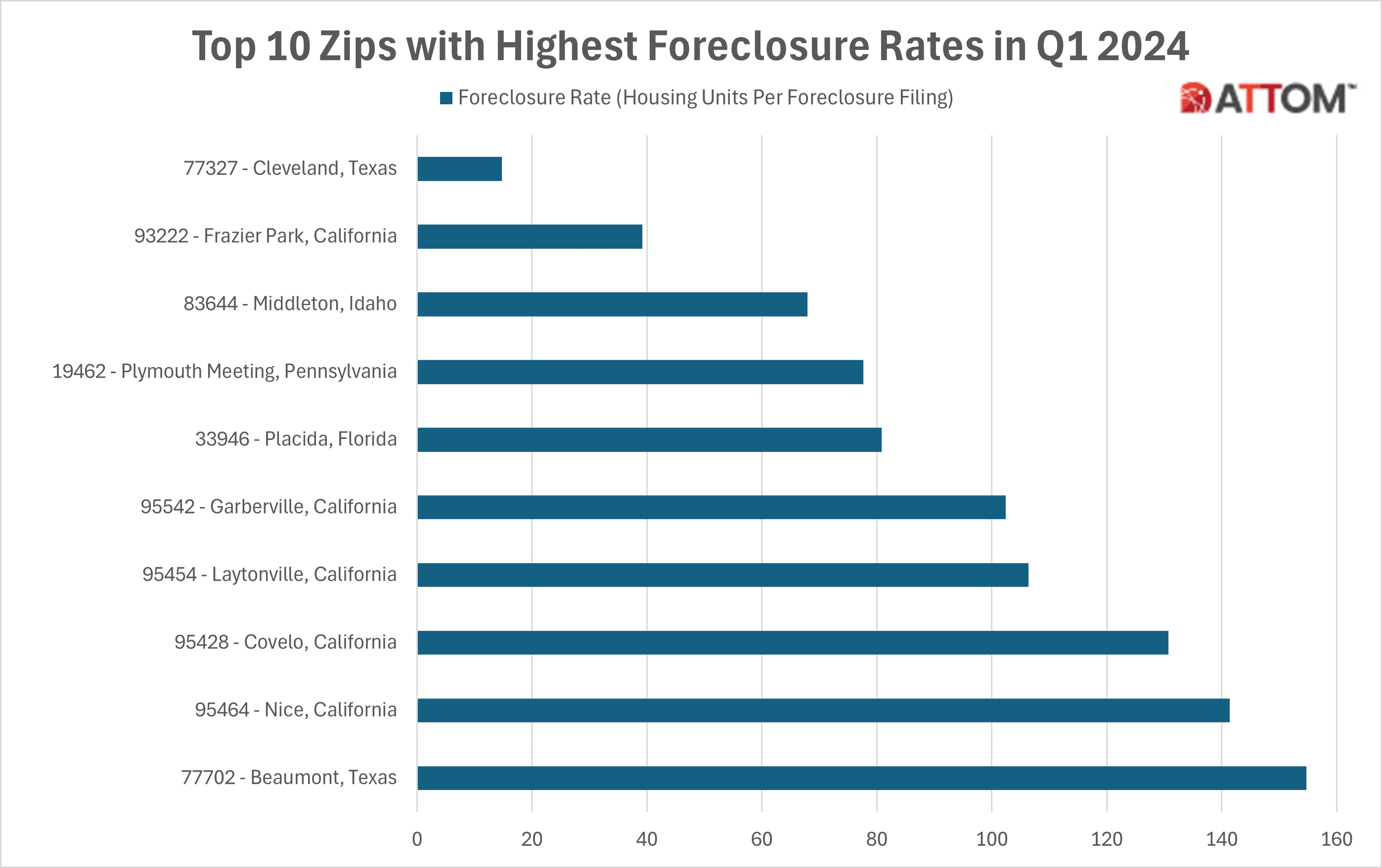In this post, we take a more granular look by diving deep into the data behind ATTOM’s Q1 and March 2024 foreclosure report to uncover the top 10 U.S. zip codes with the highest foreclosure rates in Q1 2024. Among those larger zips with 1,000 or more housing units and 10 or more foreclosure filings in Q1 2024, those with the worst foreclosure rates include: 77327 – Cleveland, Texas (on in every 15 housing units); 93222 – Frazier Park, California (one in every 39); 83644 – Middleton, Idaho (one in every 68); 19462 – Plymouth Meeting, Pennsylvania (one in every 78); 33946 – Placida, Florida (one in every 81); 95542 – Garberville, California (one in every 102); 95454 – Laytonville, California (one in every 106); 95428 – Covelo, California (one in every 131); 95464 – Nice, California (one in every 141); and 77702 – Beaumont, Texas (one in every 155).