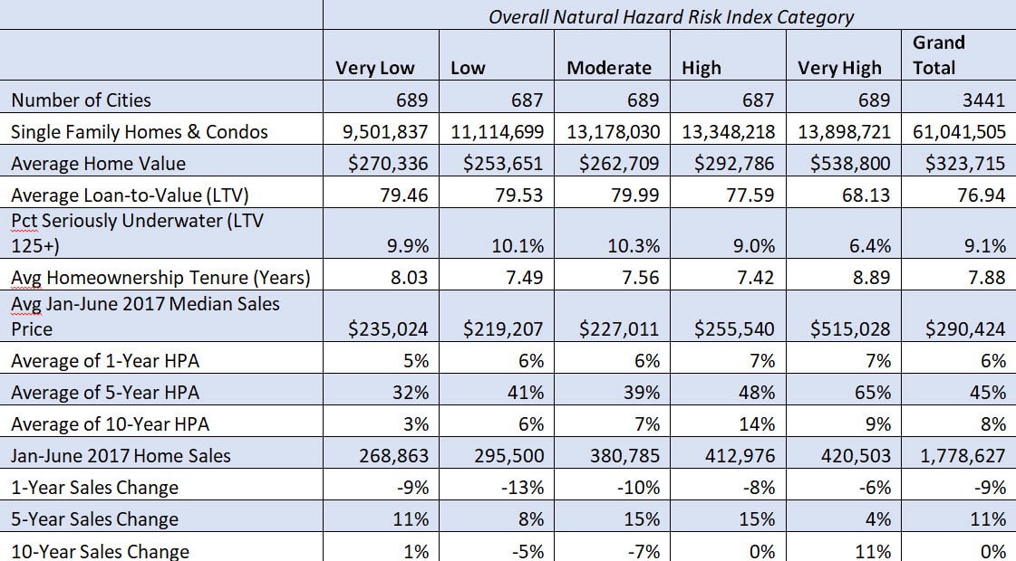 Median home prices in cities in the top 20 percent (Very High) for natural hazard risk have appreciated 65 percent on average over the past five years and 9 percent on average over the past 10 years while median home prices cities in the bottom 20 percent (Very Low) for natural hazard risk have appreciated 32 percent on average over the past five years and 3 percent on average over the past 10 years.