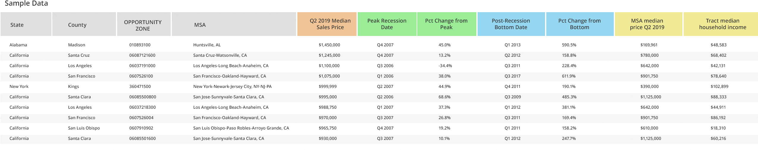 This sample is only a snippet of the full dataset available for purchase. The opportunity zones report can be customized to meet your data needs.
